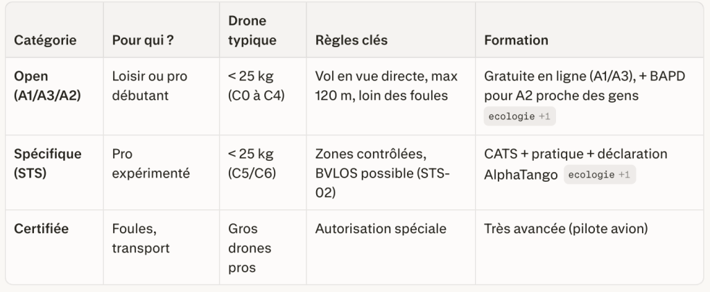 Imagine les catégories comme des niveaux de jeu : plus ton drone est grand ou ta mission complexe, plus tu montes en catégorie.